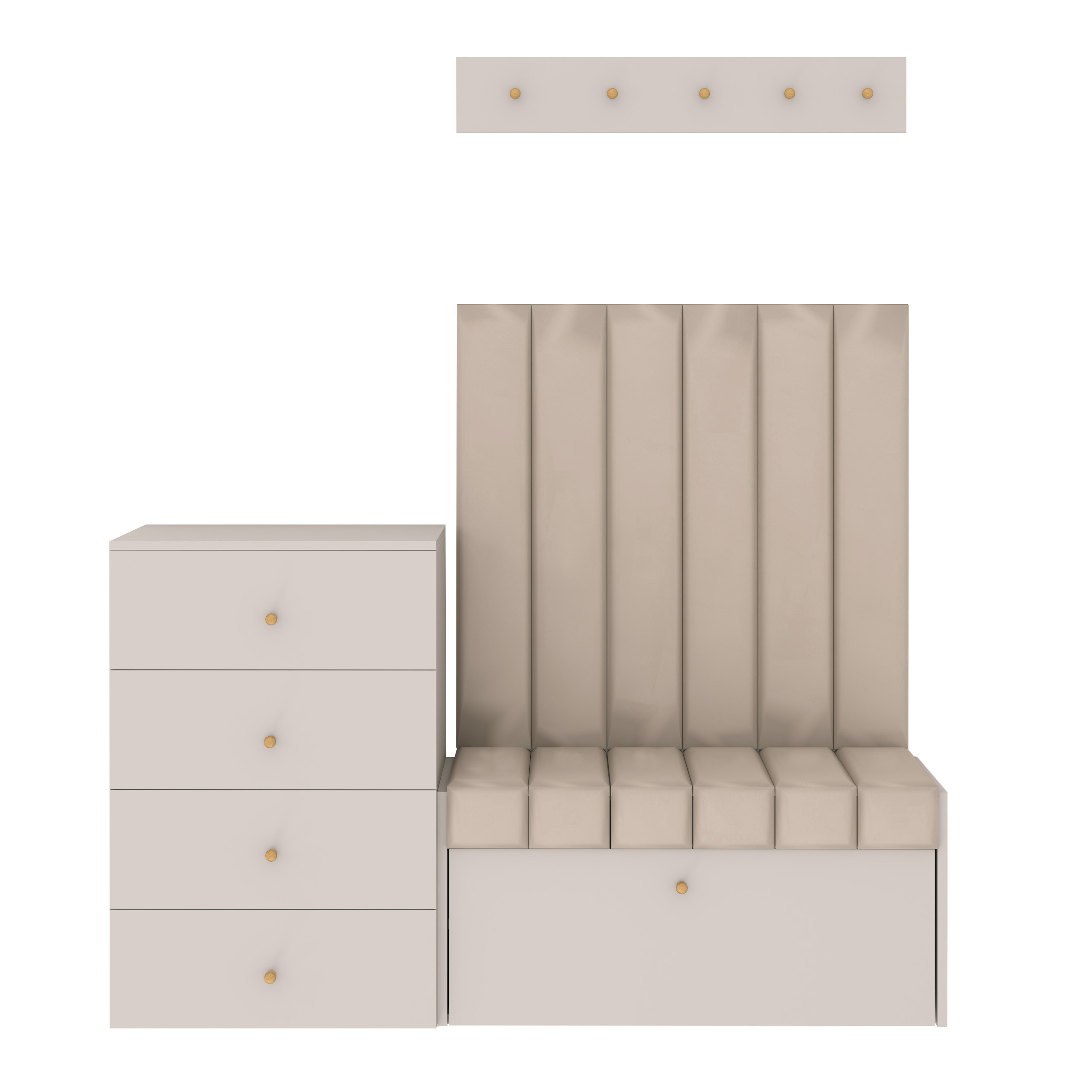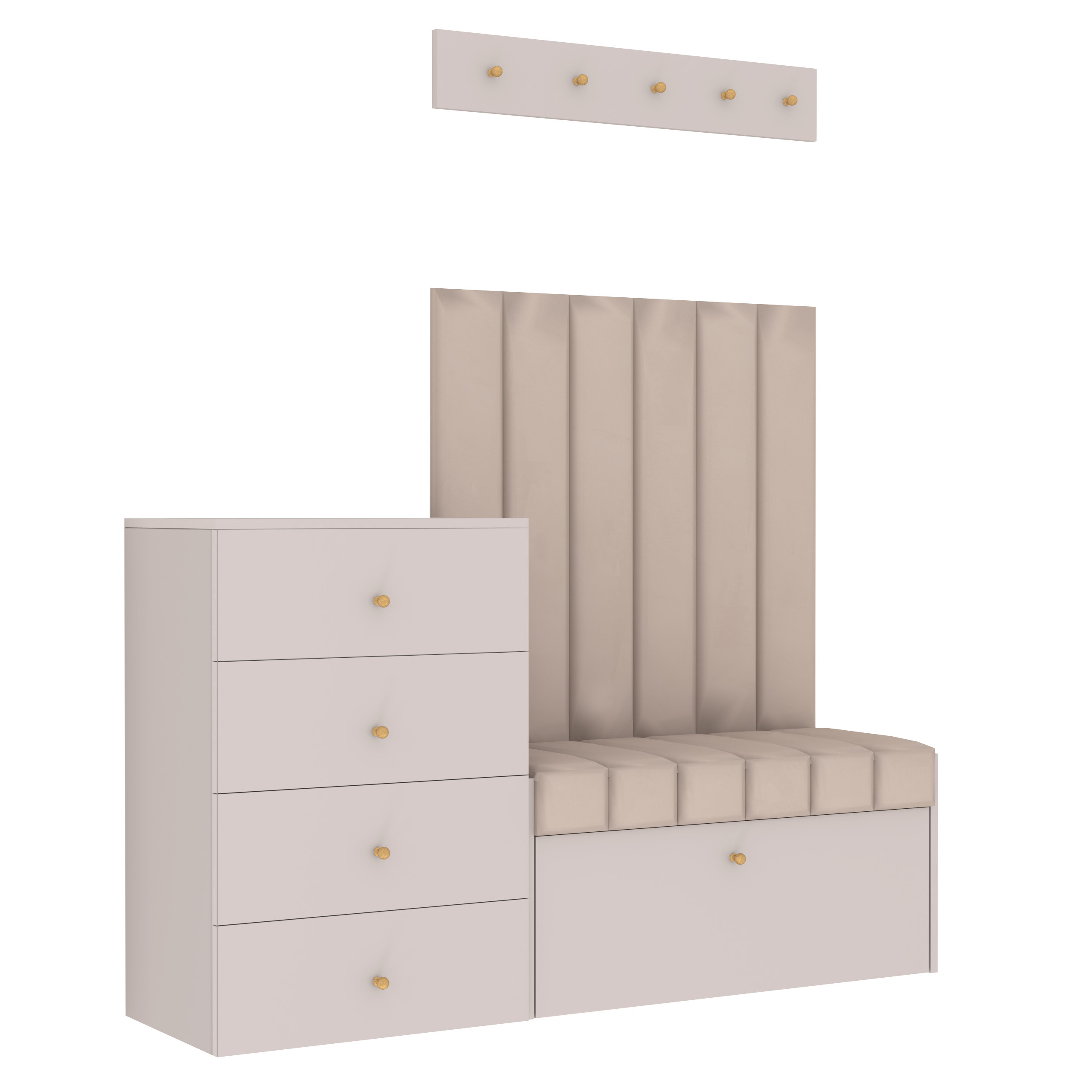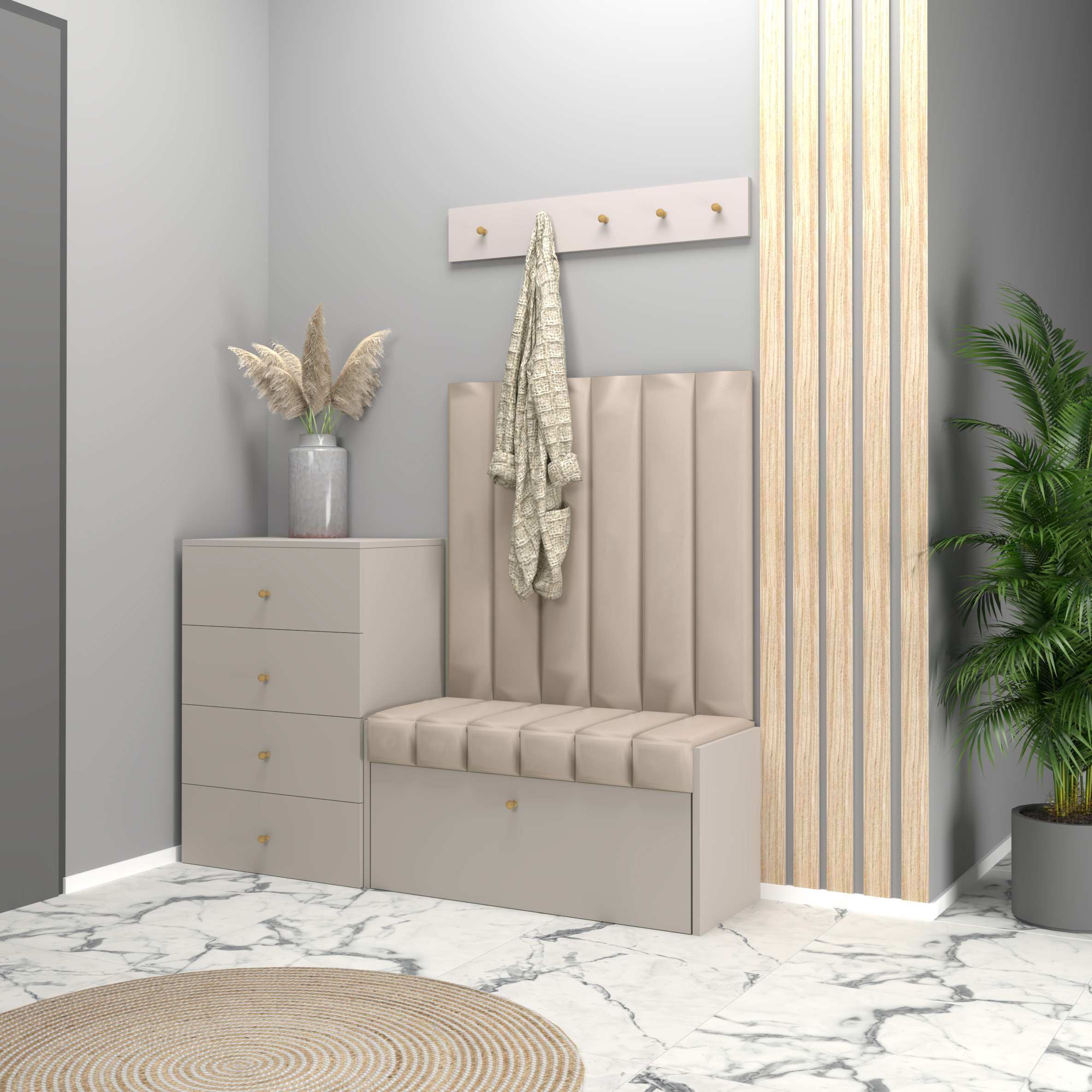 Zestaw Diana do gotowy zestaw mebli do przedpokoju, w skład których wchodzi szafka na buty z siedziskiem Diana, 6 wąskich paneli ściennych, wieszak na ubrania i komoda z czterema szufladami.