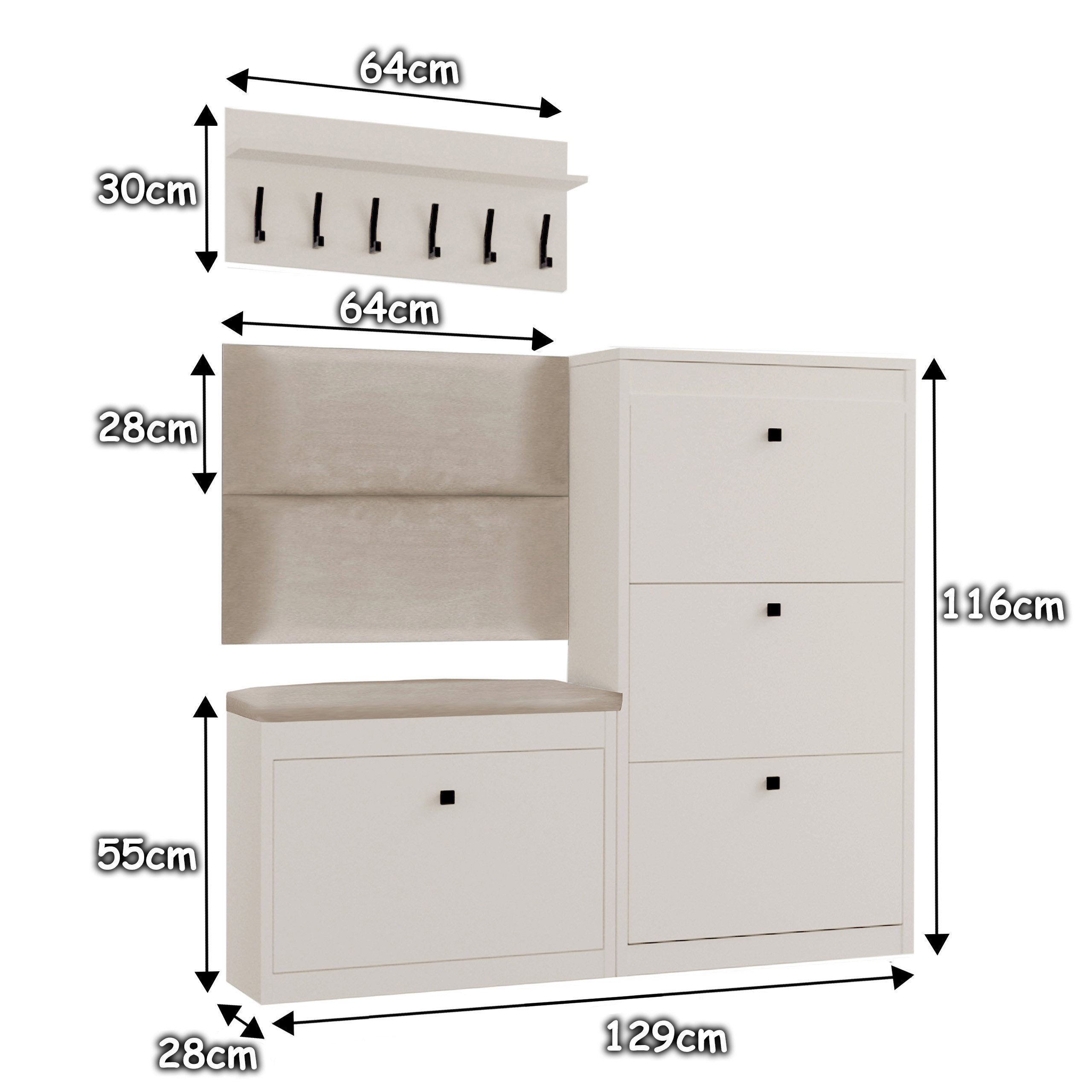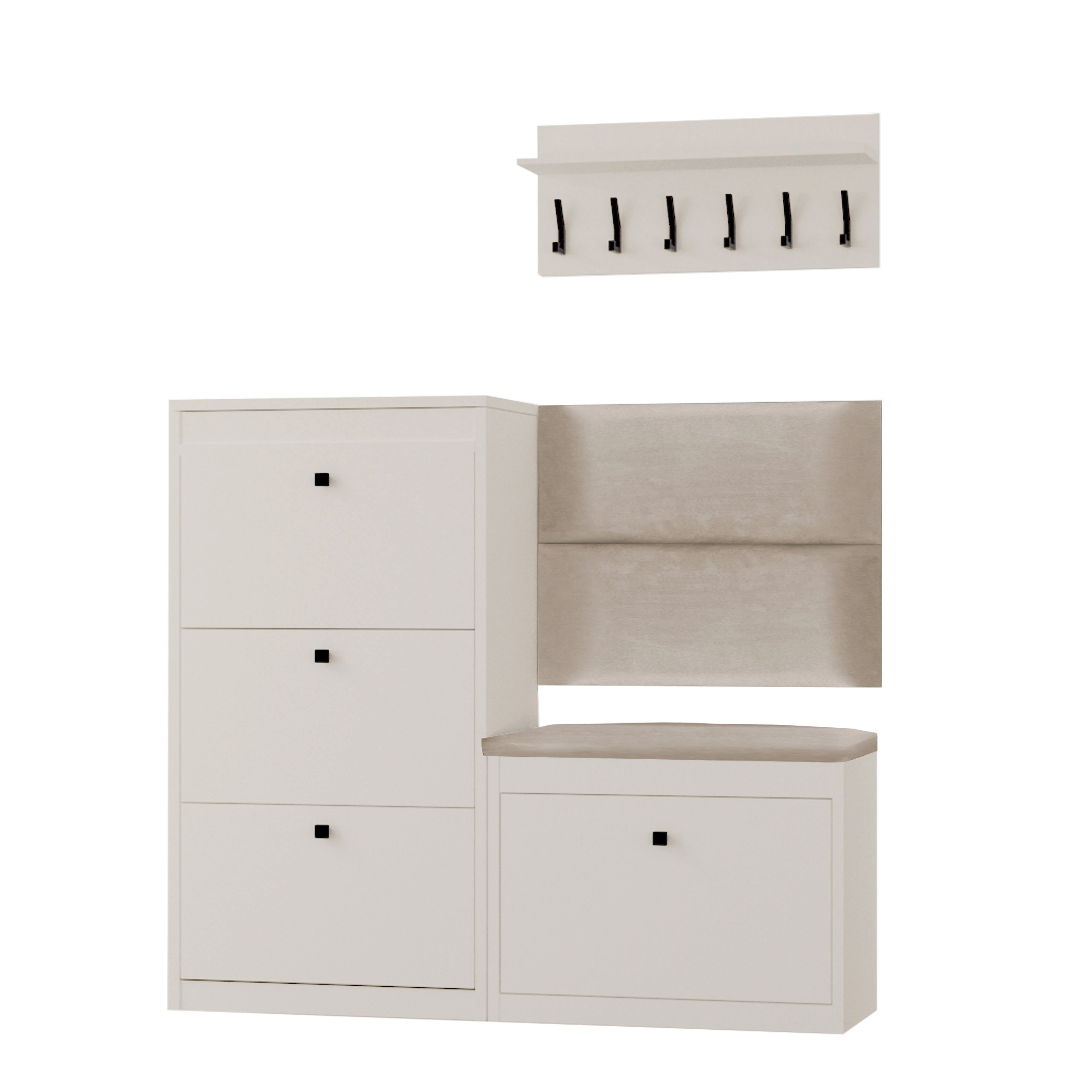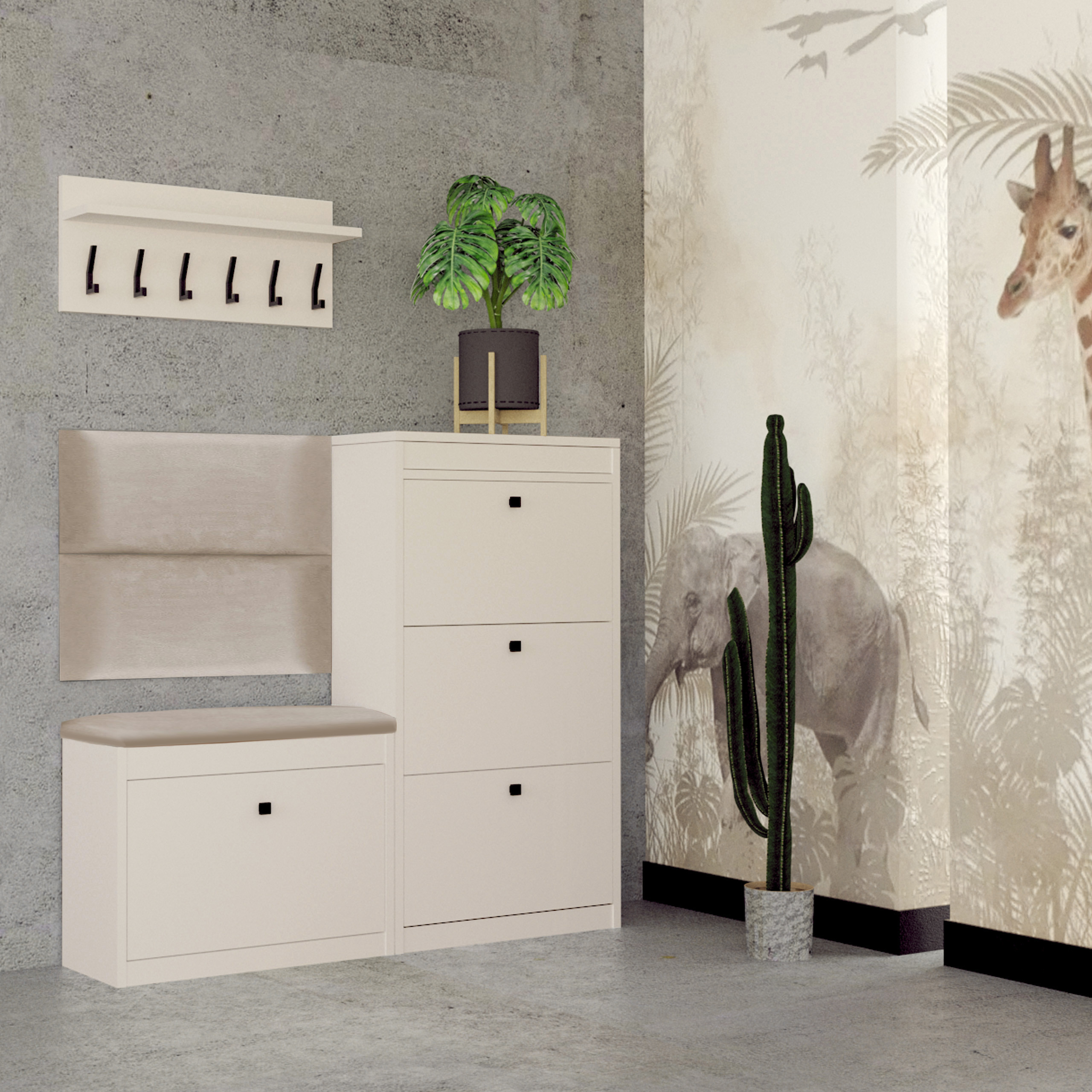 Zestaw mebli do przedpokoju Alaska 13WA112P to gotowy zestaw, który ociepli Twój przedpokój. Składa się z: wysokiej szafki na buty Alaska 13, szafki na buty z siedziskiem Alaska 11W, wieszaka na ubrania oraz dwóch ściennych paneli tapicerowanych. Gotowa aranżacja pozwoli Ci urządzić przedpokój w jednolitym stylu. Wysoka szafka na buty posiada trzy podwójne regulowane przegrody i praktyczny schowek na drobiazgi otwierany od góry szafki. Praktyczny schowek znajduje się również pod wygodnym, wykonanym z eleganckiej tkaniny welurowej siedziskiem w kolorze beżowym.