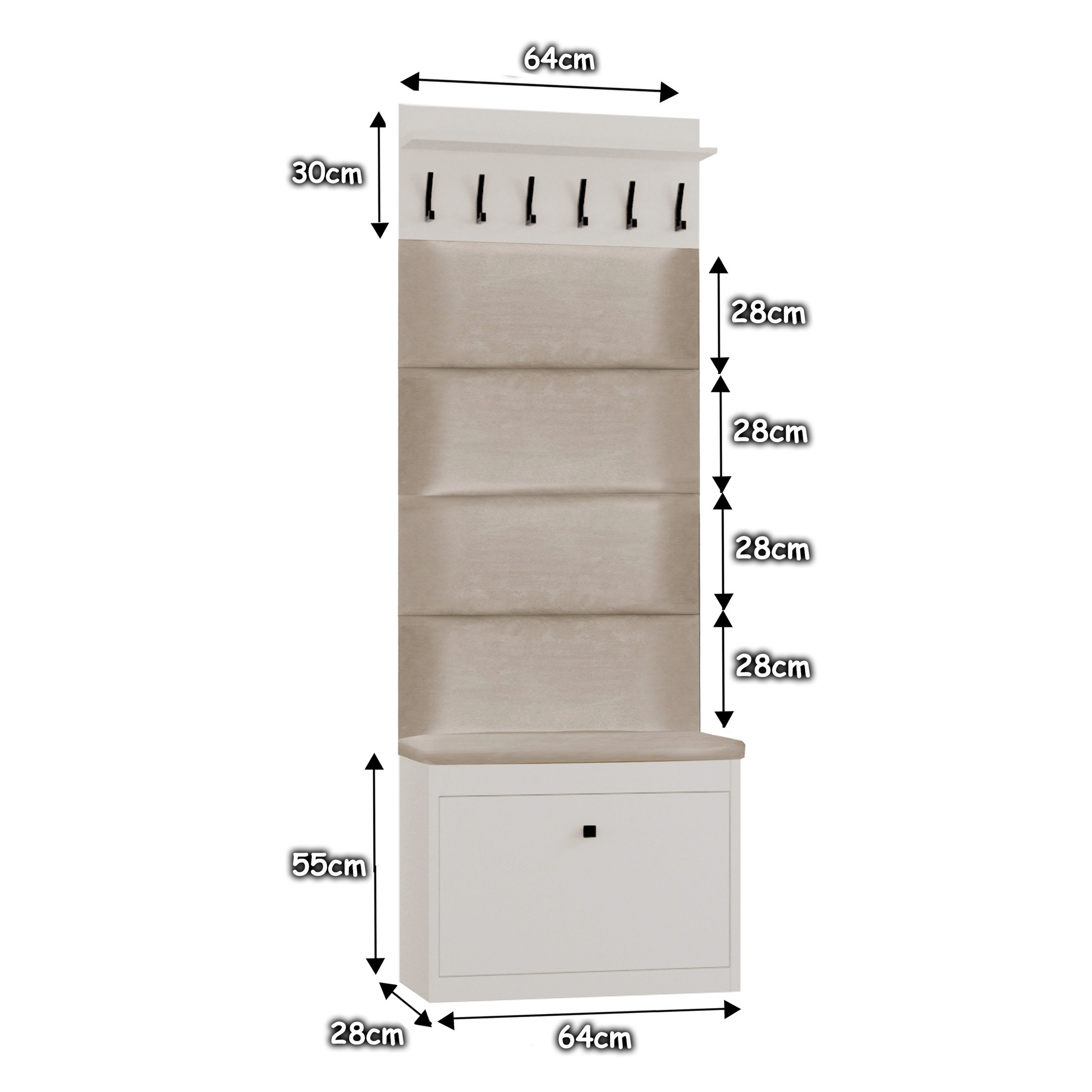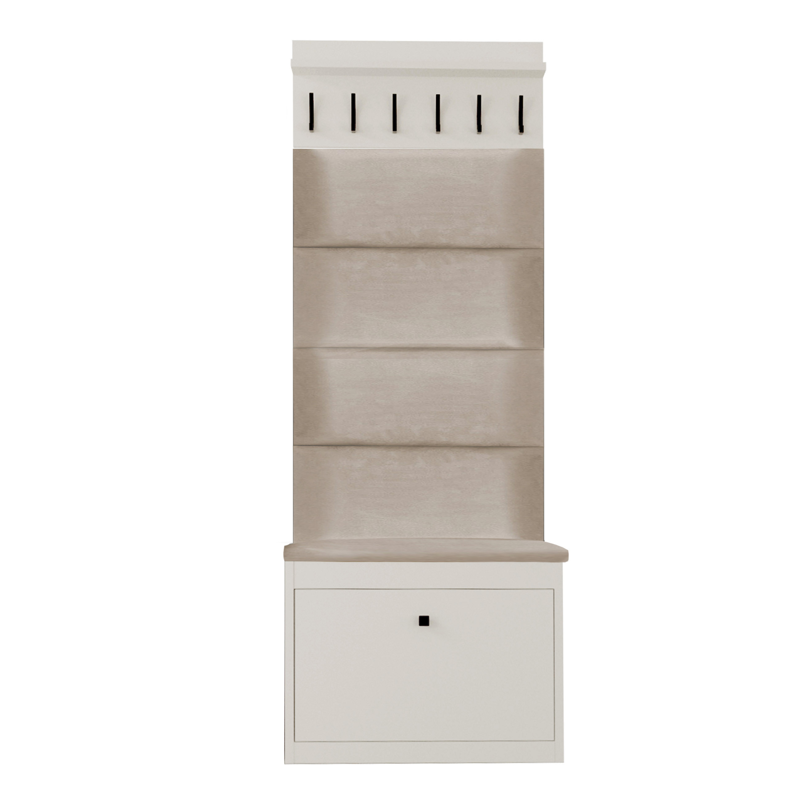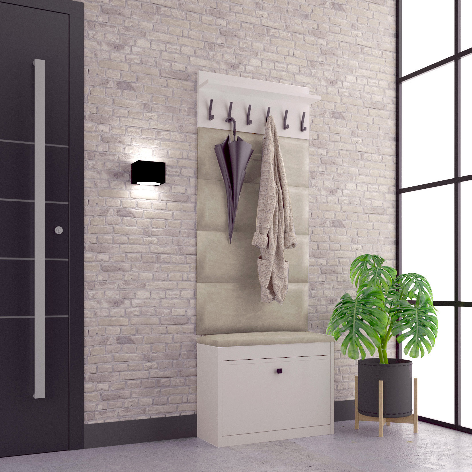 Zestaw mebli do przedpokoju Alaska WA114P składa się z: szafki na buty z siedziskiem Alaska 11, wieszaka na ubrania Alaska oraz czterech paneli tapicerowanych. Gotowa aranżacja pozwoli Ci urządzić przedpokój w jednolitym stylu. Szafka pod siedziskiem posiada praktyczny schowek. Panele na ścianę oraz siedzisko wykonane są z eleganckiej i wytrzymałej tkaniny welurowej w kolorze beżowym.