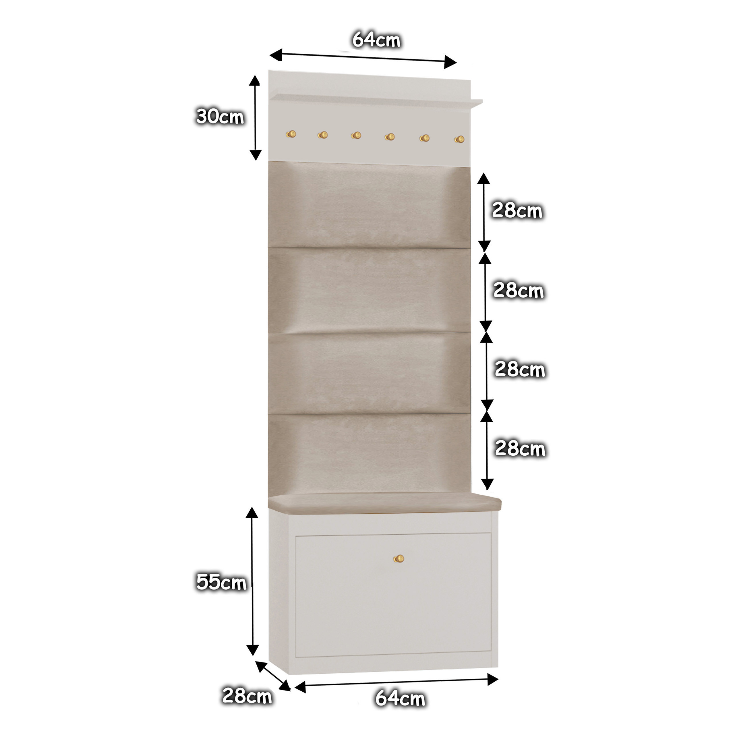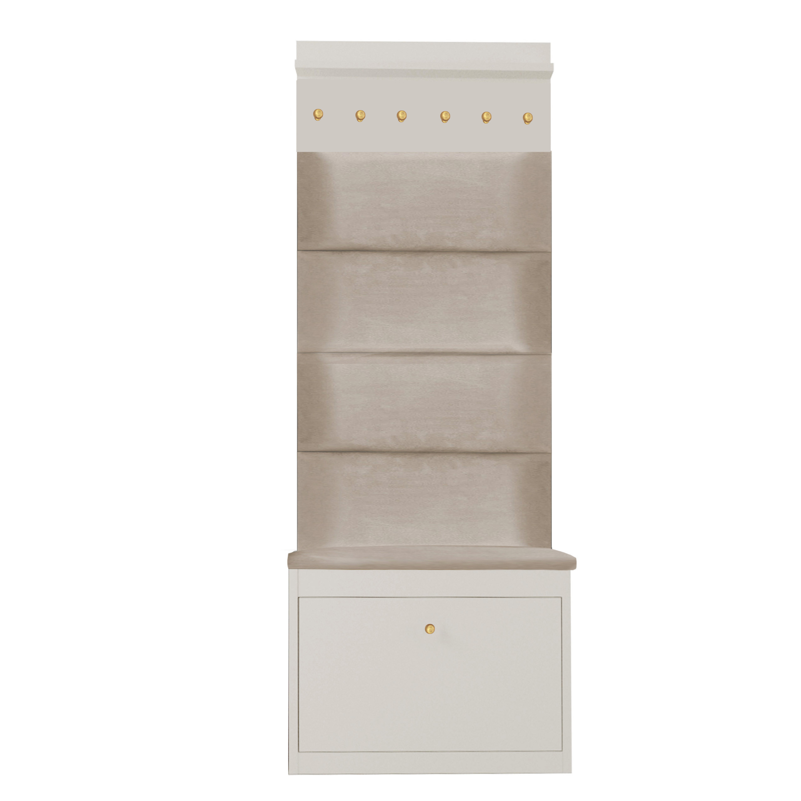 Szafka pod siedziskiem posiada praktyczny schowek. Panele na ścianę oraz siedzisko wykonane są z eleganckiej i wytrzymałej tkaniny welurowej w kolorze beżowym. Złote uchwyty w szafce jak i wieszkamu wykonane są z metalu w kolorze stonowanego złota.