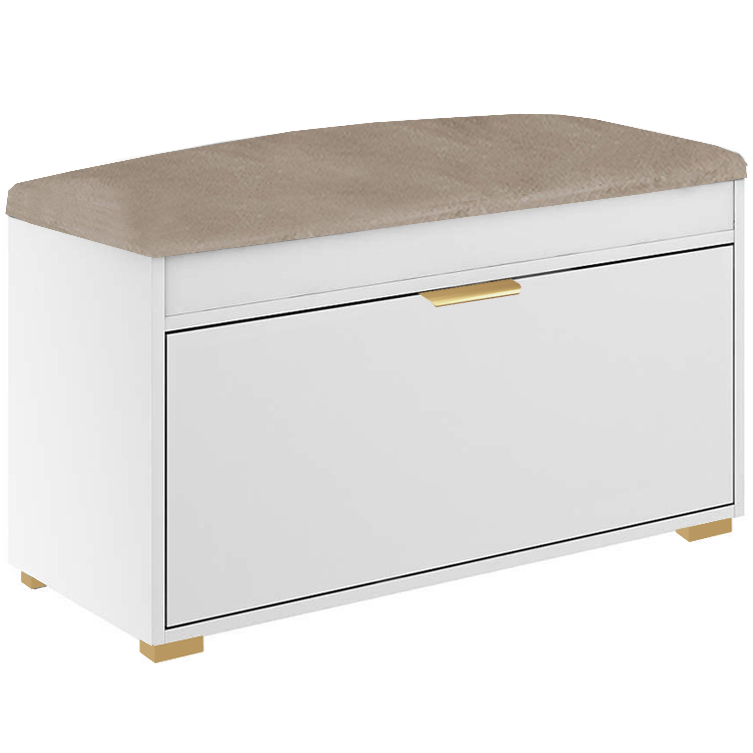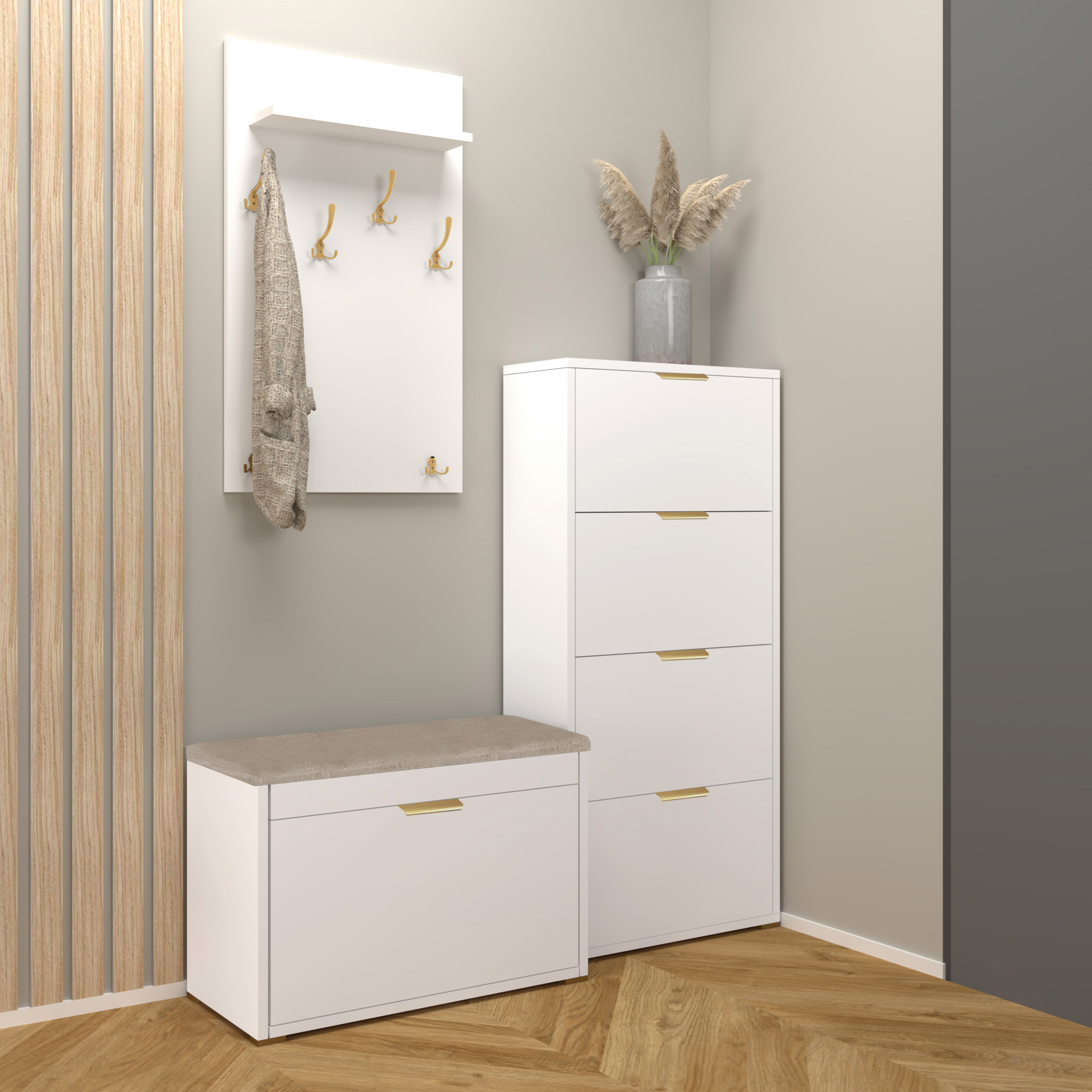 Gotowa aranżacja pozwoli Ci urządzić przedpokój w jednolitym stylu. Praktyczny duży panel wieszaka uchroni ścianę przed zabrudzeniem. Wysoka szafka na buty posiada aż cztery uchylne przegrody na buty. Szafka na buty z wygodnym siedziskiem przedzielona jest wewnątrz dodatkową półką. Siedzisko wykonane jest z wysokiej jakości tkaniny w kolorze beżowym. Uchwyty i wieszaki wykonane są z metalu w kolorze szczotkowanego złota. Nóżki meblowe wykonane są w tworzywa w kolorze złotym. Wysoką szafkę należy przekręcić do ściany.
