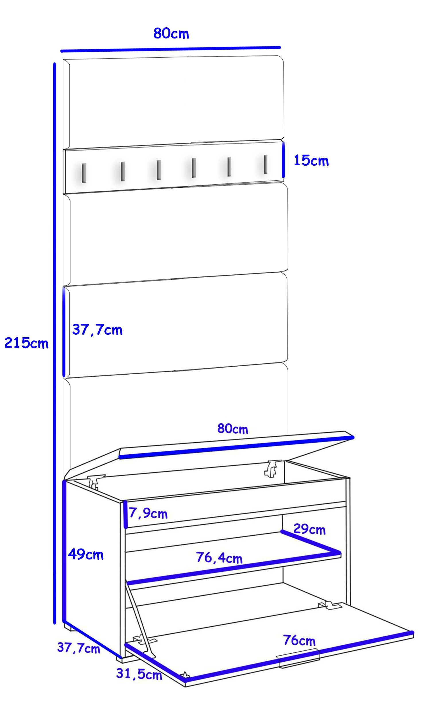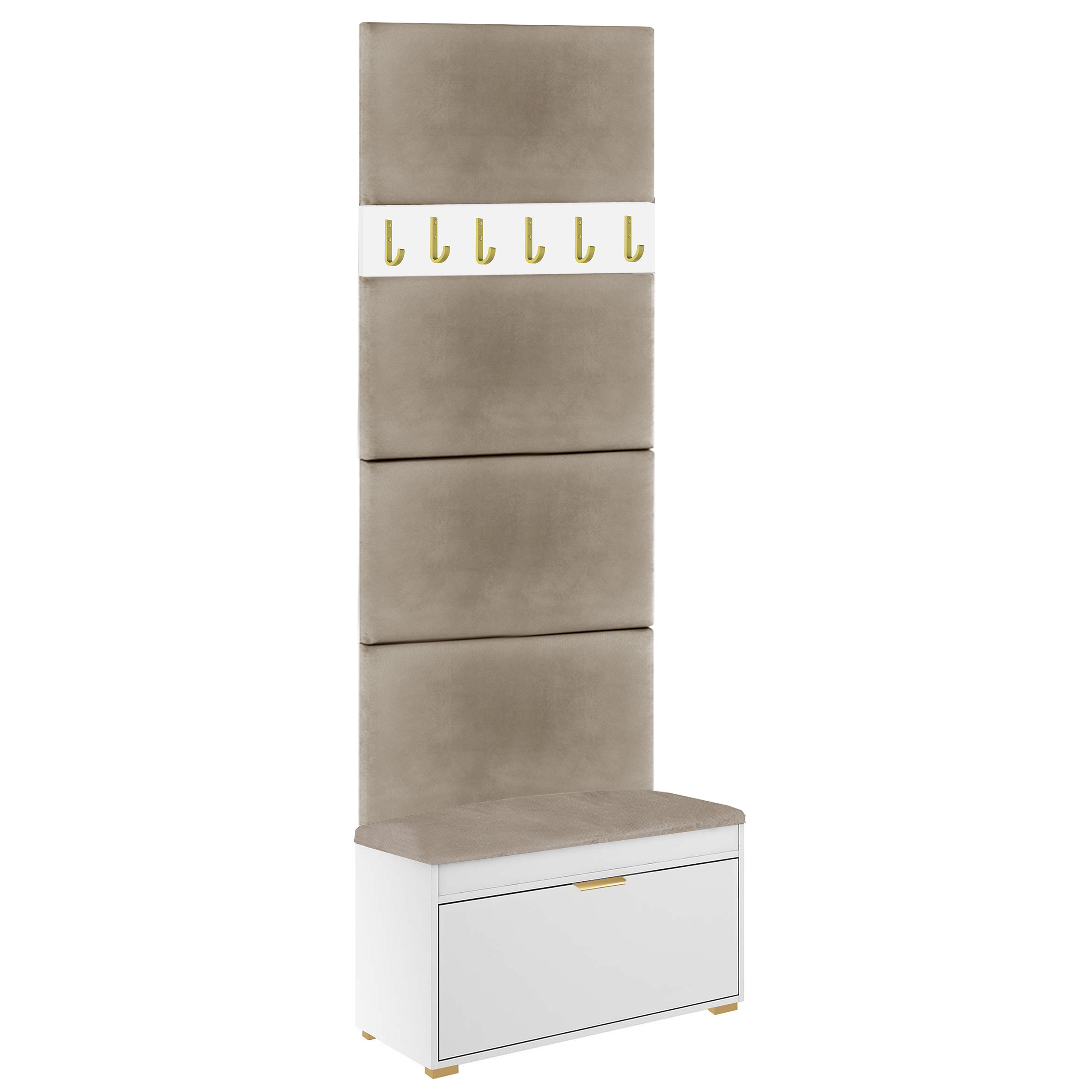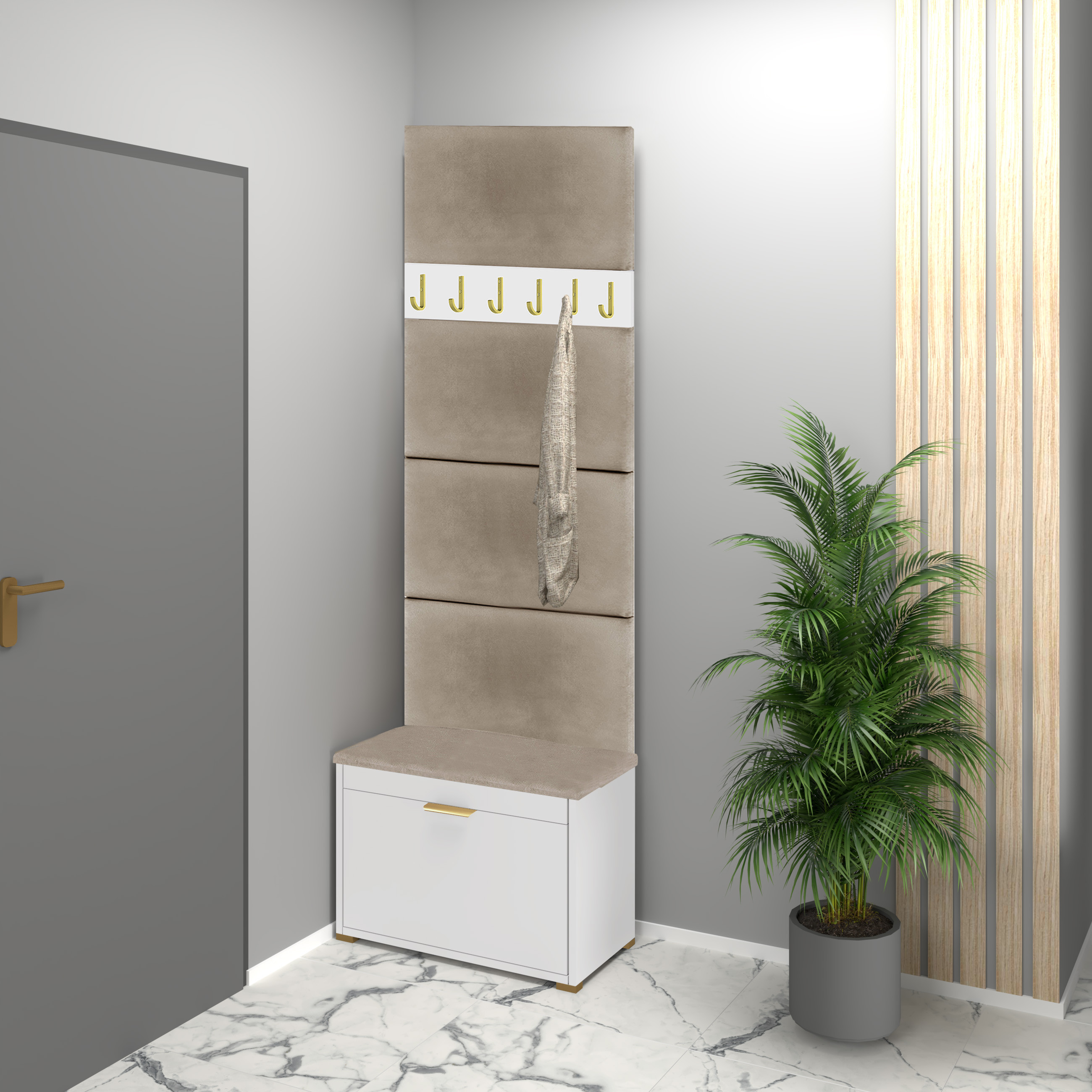 Zarówno panele jak i siedzisko wykonane są w przyjemnej w dotyku wysokiej jakości tkaniny welurowej w kolorze beżowym. Dodatkową zaletą szafki jest ukryty pod siedziskiem schowek, w którym pomieścisz wszystkie przedmioty, które warto mieć "pod ręką" przy wyjściu z domu np. klucze, parasol, smycz dla czworonoga.