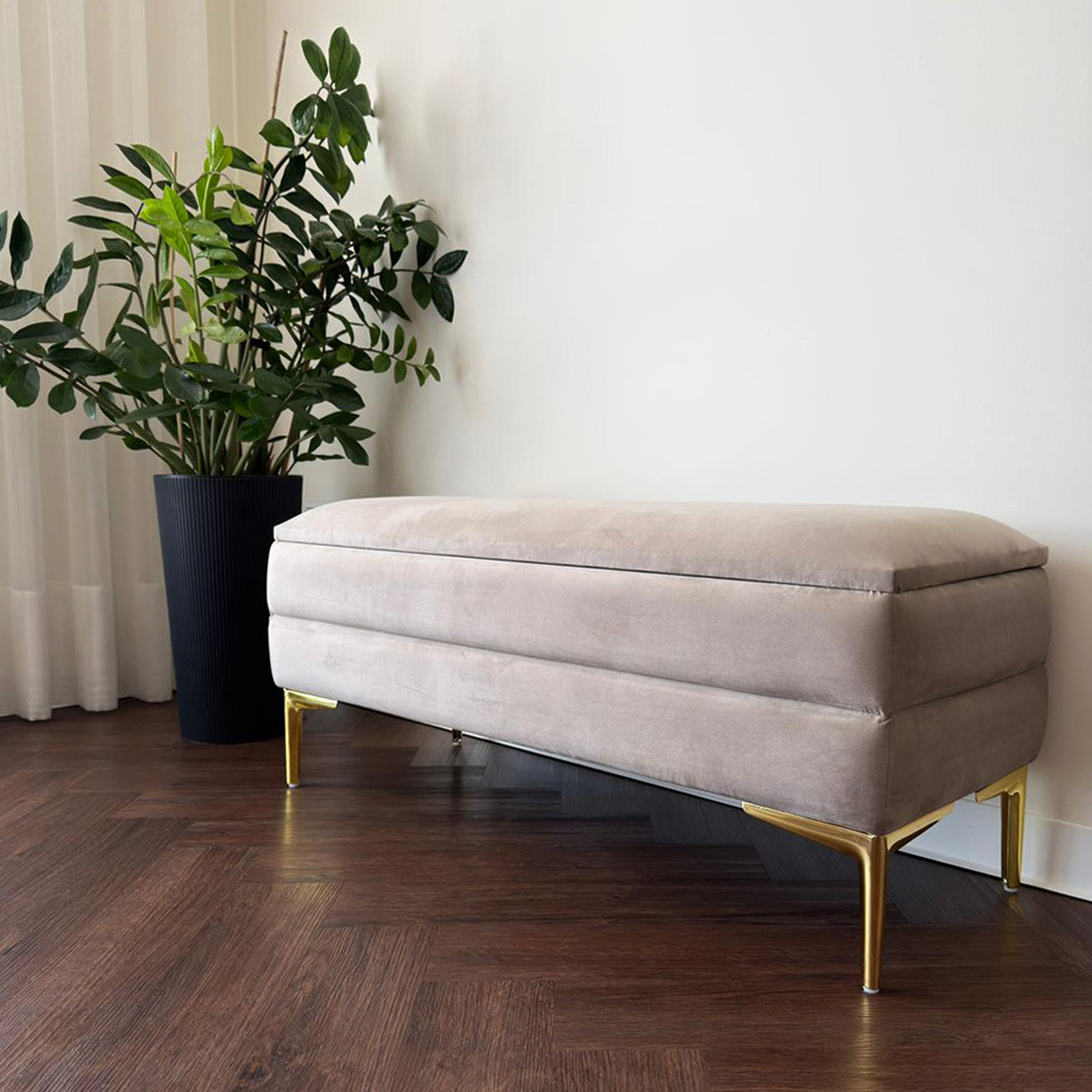 Pufa tapicerowana ze schowkiem to praktyczny mebel do przedpokoju, na którym wygodnie usiądziesz by założyć buty. Wykonana z najwyższej jakości materiałów, w pięknym odcieniu beżu. Złote metalowe nóżki nadadzą elegancji i sprawią, że możesz dodatkowo położyć kapcie pod pufą.